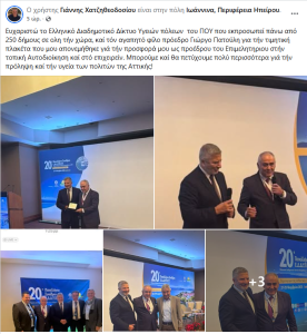 “Ευχαριστώ το Ελληνικό Διαδημοτικό Δίκτυο Υγειών πόλεων του ΠΟΥ που εκπροσωπεί πάνω από 250 δήμους σε ολη τήν χώρα, και τον αγαπητό φίλο πρόεδρο Γιώργο Πατούλη για την τιμητική πλακέτα που μου απονεμήθηκε για την προσφορά μου ως προέδρου του Επιμελητηρίου στην τοπική Αυτοδιοίκηση και στο επιχειρείν. Μπορούμε και θα πετύχουμε πολύ περισσότερα για την πρόληψη και την υγεία των πολιτών της Αττικής!”