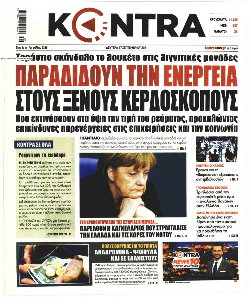 MEDIA Οι πρώτες σελίδες των εφημερίδων, σήμερα Δευτέρα 27 Σεπτεμβρίου FacebookTwitterPinterestWhatsApp Οι πρώτες σελίδες των εφημερίδων, σήμερα Δευτέρα 27 Σεπτεμβρίου: