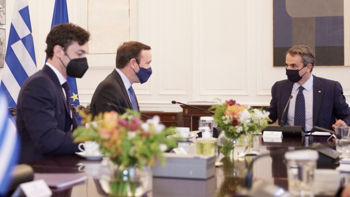 Την πεποίθησή του ότι οι ελληνοαμερικανικές σχέσεις ενισχύονται σε όλα τα επίπεδα εξέφρασε ο πρωθυπουργός Κυριάκος Μητσοτάκης, που συναντήθηκε σήμερα στο Μέγαρο Μαξίμου με τους Αμερικανούς γερουσιαστές Κρις Μέρφι και Τζον Όσοφ. Στο επίκεντρο των συνομιλιών βρέθηκαν και οι εξελίξεις στην Ανατολική Μεσόγειο, τη Μέση Ανατολή και το Αφγανιστάν.